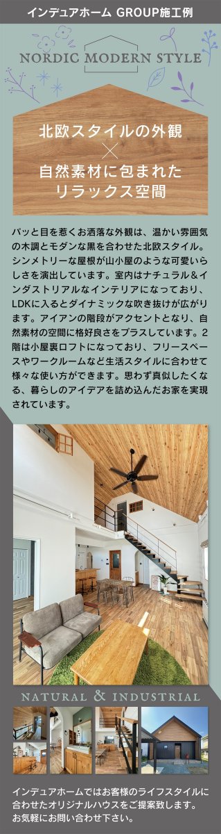 木調と黒を組み合わせた北欧スタイルの外観が魅力の住まい。シンメトリーな屋根が可愛らしさを演出し、吹き抜けのLDKにはアイアン階段が映えるデザイン。小屋裏ロフトは多用途に活用可能。お洒落で機能的な理想の家。