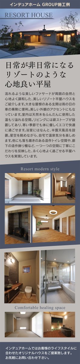 自然と調和する美しいファサードが魅力のリゾート平屋。薪ストーブや半露天風呂、造作棚などこだわり満載の設計で、癒しと快適さを両立。永く心地よく暮らせる理想の住まいです。