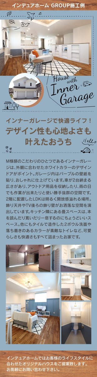 白いインナーガレージが魅力。2台駐車や収納に便利で、室内は開放感あるLDKや畳スペースなど快適性とデザイン性を兼ね備えた理想の住まいです。