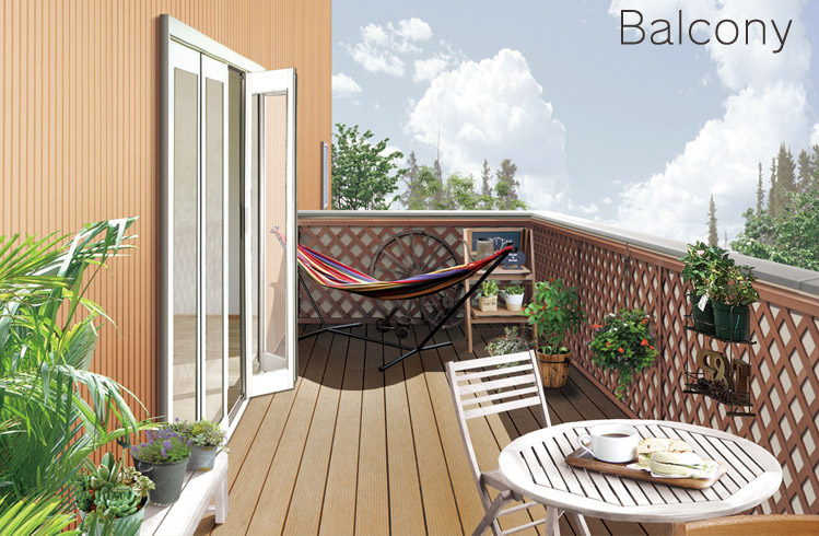 プライベートなアウトドア空間で、自然に囲まれた寛ぎのスペースを楽しむ。ウッドデッキを敷き、お気に入りのグリーンを飾る。イスやテーブルをセットして家族でランチを楽しむ。ハンモックで昼寝をしてみたり。バルコニーならではのオープンエアな空間。